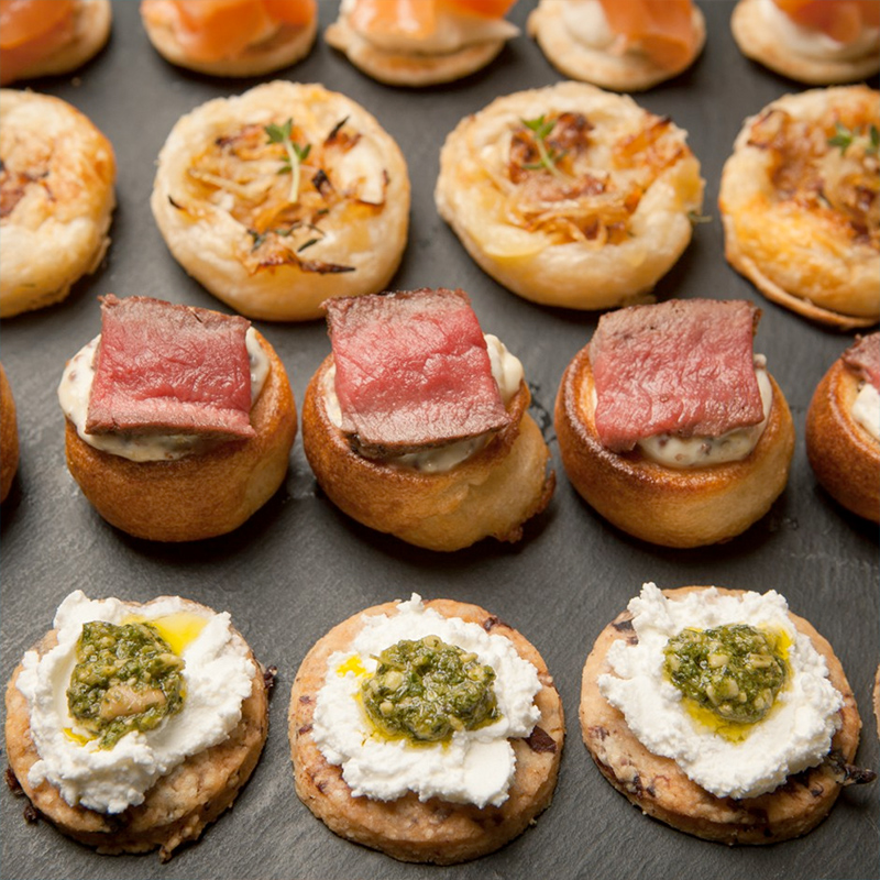 Beauty and taste. Our nifty nibbles and classy canapés will be guaranteed to get your party started in no time. Whether we are handing out Mini Yorkshires or giving your guests some sexy sushi, everyone will sure to feel thoroughly spoilt and impressed by our magnificent morsels. Canapés are also often the showcase for a really good caterer where more than ever the taste and skills of the chef meet the flare of the designer and push the boundaries of their imagination to new limits. The options are endless and you will almost certainly want some fish, some meat, some vegetarian, not to forget the permutations of some being hot and cold. And don’t forget about sweet canapés too. Imagine the delight of your guests as one of stylish staff sweep effortlessly across the floor with a tray packed with shot glasses full of mini trifles, crème brûlée and mousses or some delicious little brownies dusted with gold glitter.